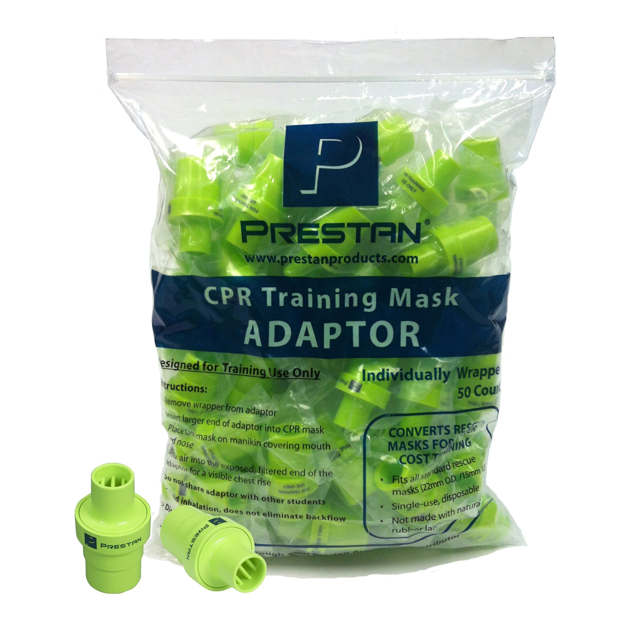 Prestan CPR Training Mask Adaptors (individually wrapped), available in 10-count and 50 count bags